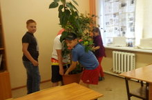 После завтрака ребята вновь включились в работу. Работы в школе достаточно. Нужно и цветы пересадить, и кабинеты подмести, и книги на склад перетаскать, да и во дворе школы хлопот хоть отбавляй.
