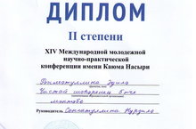 Поздравляем учащуюся 11 класса Рахматуллину А.(уч.Сунгатуллина Н.М.), занявшую 2 место на международной НПК имени К.Насыйри.