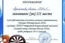 В субботу 13 февраля состоялись республиканские массовые лыжные соревнования "Лыжня Татарстана 2016". Поздравляем призера лыжных гонок ученицу 11 класса Абдрахманову Лейсан. Молодец!!!