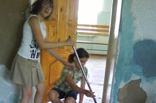 Сегодня «Праздник труда». После завтрака ребята включились в работу. Работы в школе много. Нужно и кабинеты подмести, и книги на склад перетаскать, да и во дворе школы хлопот хоть отбавляй.