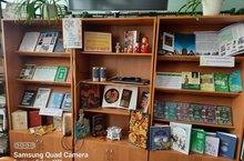 В рамках Года культурного наследия народов России в школьном информационно-библиотечном центре открылась выставка-инсталляция, посвященная этому событию. На выставке можно познакомиться с искусством народных промыслов. Это книги по резьбе по дереву, вышивке, росписи в стиле хохломы. Отдельно на выставке представлена краеведческая тема «Культурное наследие Татарстана». Вся выставка оформлена предметами народного творчества. Это такие исконно русские сувениры, как матрешка, деревянная ложка, изделия городецкой и хохломской росписи.