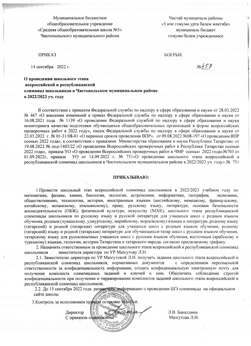 Приказ "О проведении школьного этапа олимпиады 2022-2023 уч.год".