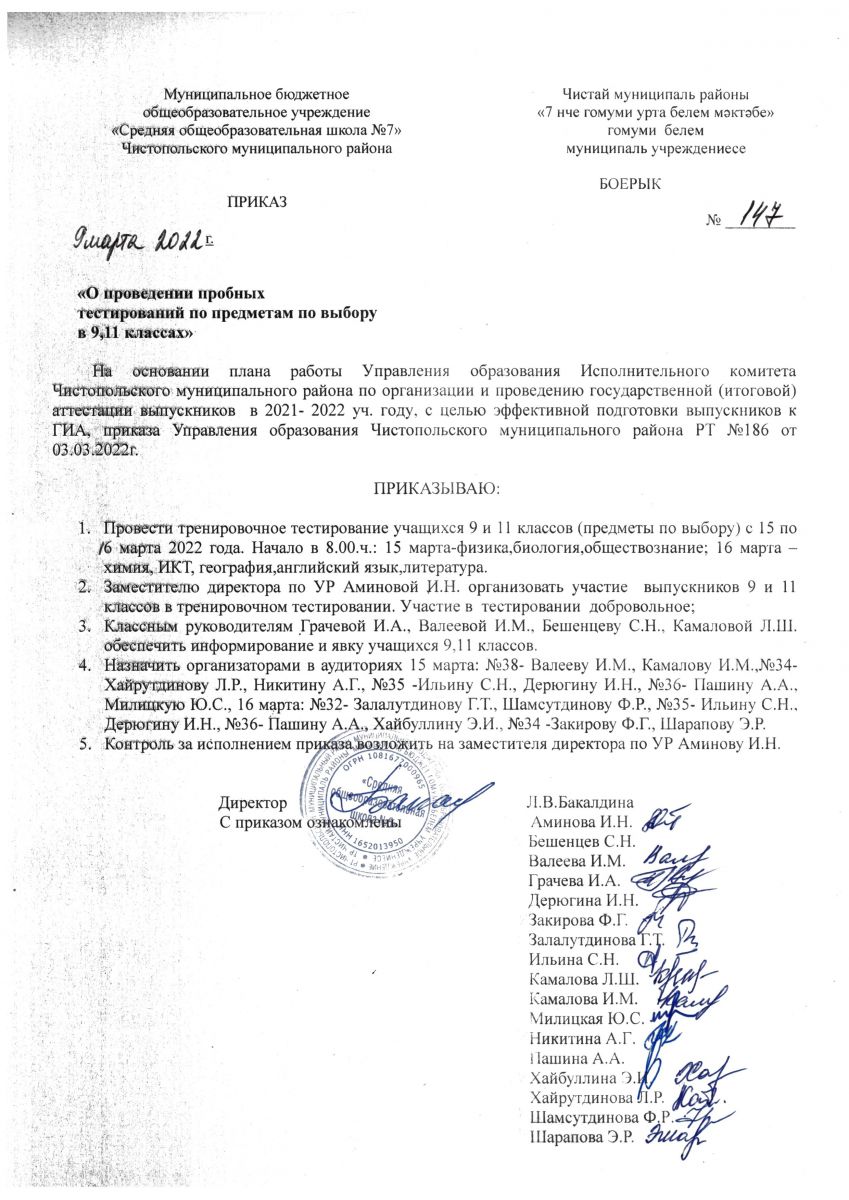 Приказ о проведении пробных тестирований по предметам по выбору в 9,11 классах