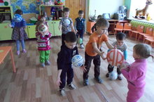 Физкультура шөгелендә балалар туп белән уйнарга өйрәнәләр. Идәнгә бәреп тоту, тәгәрәтү, бер-беренә ыргыту кебек күнегүләрне бик теләп башкаралар.