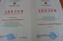 11нче сыйныф укучысы Гизатуллина Фәйрүзә Мәгариф министры Э.Н.Фәттахов кул куйган диплом белән бүләкләнде, җитәкчесе Хамидуллина Ирина Альзамовна.