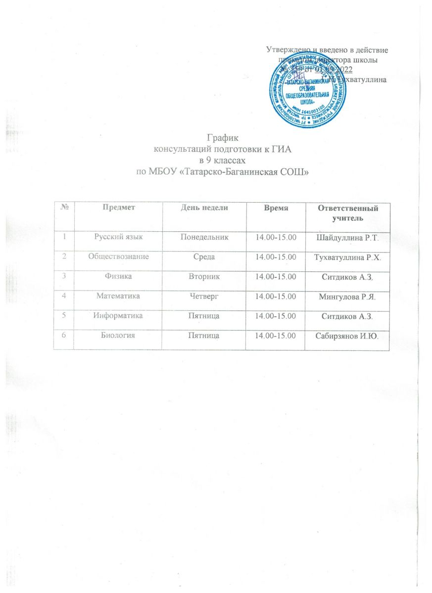 График консультаций подготовки к ГИА в 9 классах на 2022-2023 уч.год