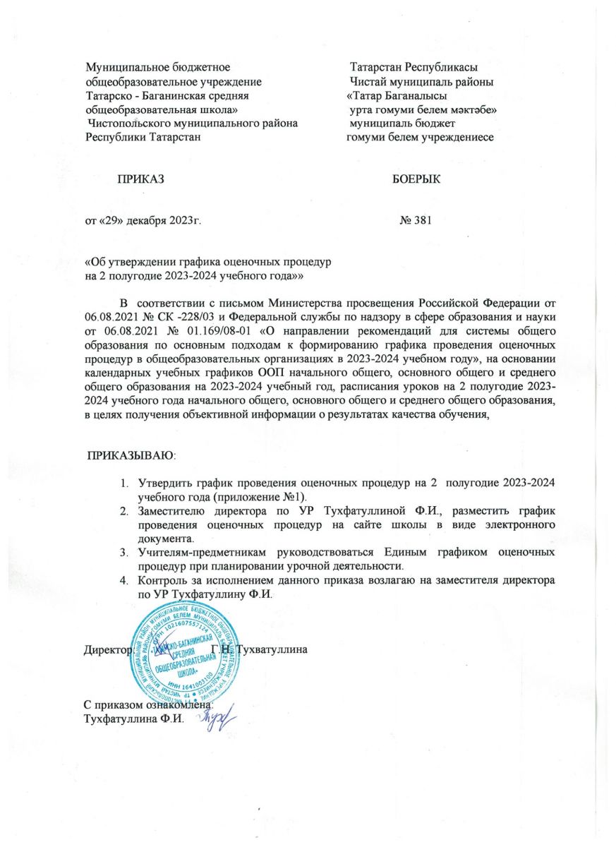 Приказ об утверждении графика оценочных процедур на II полугодие 2023-2024 учебного года