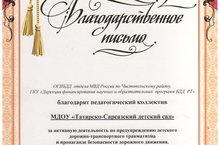 За активную деятельность по предупреждению детского дорожно-транспортного травматизма и пропаганде безопасности дорожного движения ОГИБДД отдела МВД России по Чистопольскому району наградил наш педагогический коллектив благодарственным письмом.