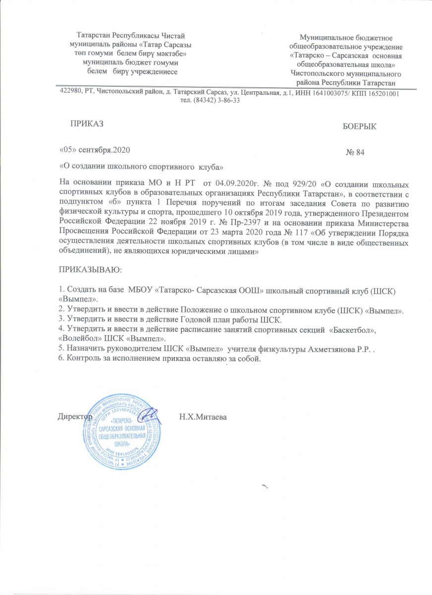 Приказ по школе о создании школьго спортивногоклуба "Вымпел"