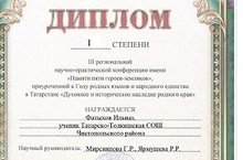 Поздравляем победителя III региональной научно-практической конференции имени "Пяти героев-земляков"., приуроченный к Году родных языков и народного единства в Татарстане "Духовное и историческое наследие родного края", Фатыхова Илназа, учащегося 8 класса нашей школы.