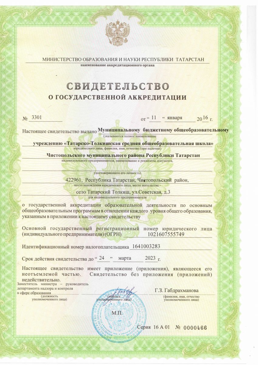Муниципальное бюджетное общеобразовательное учреждение «Татарско-Толкишская средняя общеобразовательная школа» Чистопольского муниципального района Республики Татарстан