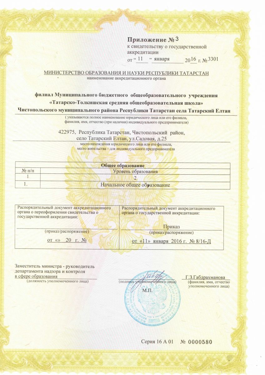 Приложение №3 Филиал МБОУ "ТТСОШ" село Татарский Елтан.