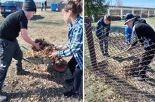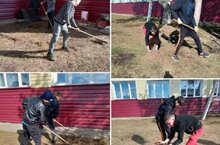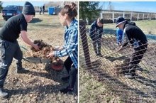 Процесс подкормки цветника. Выпускники 9 класса работают с усердием и желанием.