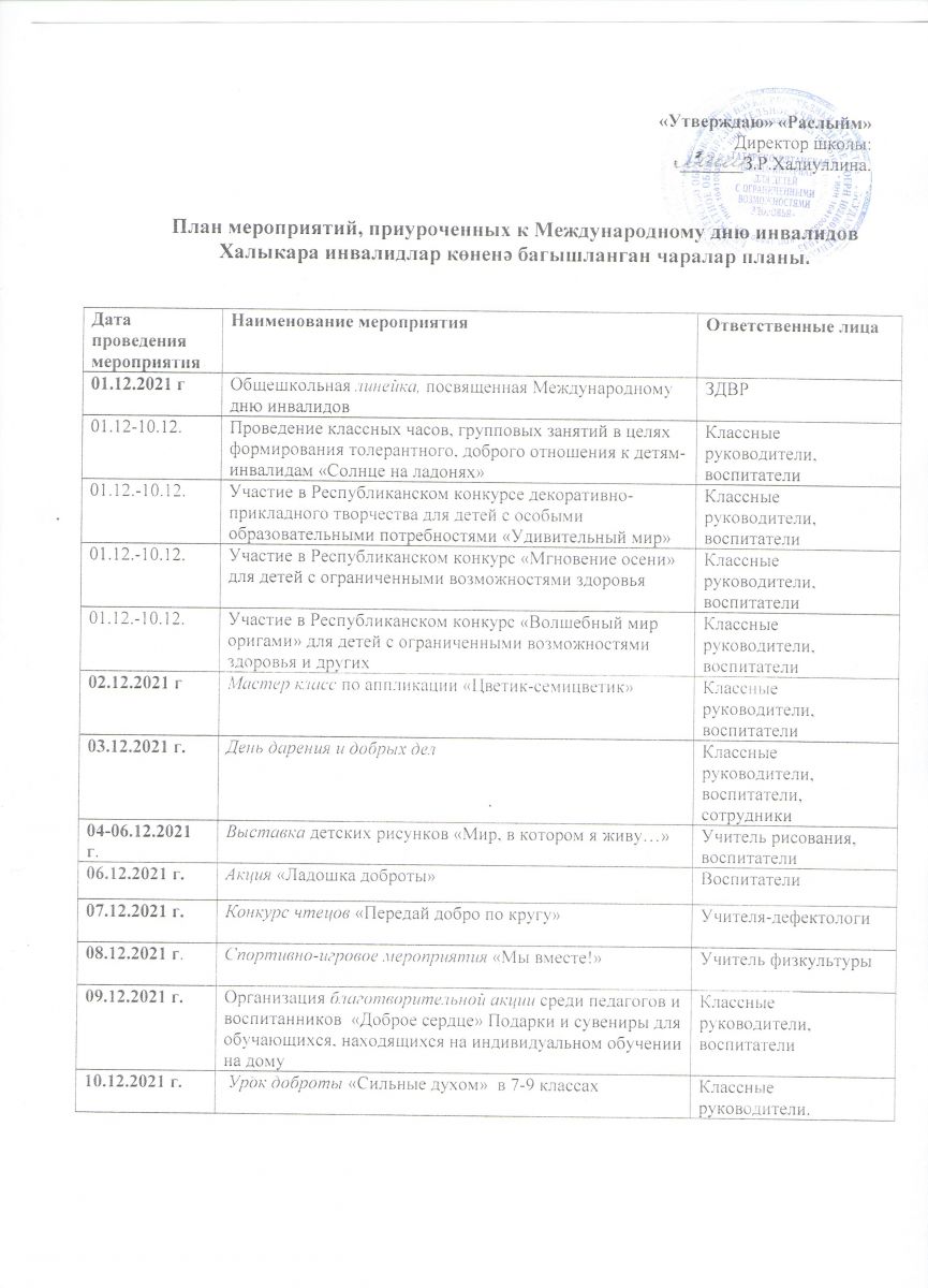 План мероприятий, приуроченных к Международному дню инвалидов.