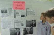 Учащиеся 6 класса у стенда «История в лицах» Личности ТАССР и РТ.
