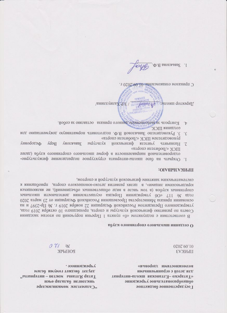 Приказ "О создании школьного спортивного клуба"