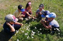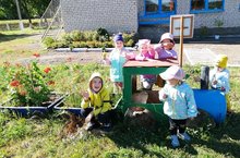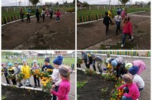 В рамках календарного планирования дети помогают воспитателям в уборке сухих цветов с клумбы.