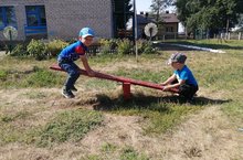 У меня и у Антошки.Дети во время дневной прогулки качаются на качелях.