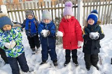 Дети во время дневной прогулки экспериментировали со снегом и сделали вывод, что снег не липкий, а рыхлый.