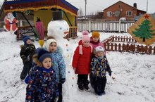 Вместо глаз - картошки.Дети разновозрастной группы во время дневной прогулки лепили снеговика.