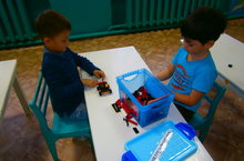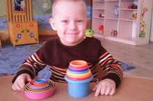 Дети ясельной группы любят играть с различными пирамидками и вкладышами, которые помогают им закреплять названия цвета, размера тарелочек и мелкую моторику.