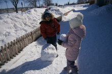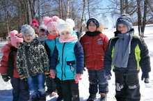 Дети старше-подготовительной группы во время дневной прогулки лепили снеговика, так как было очень тепло и снег был липкий. Они решили попрощаться со снегом до следующей зимы.