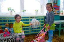 Дети старше-подготовительной группы во время свободной деятельности играют в с/р. игру "Моя семья".