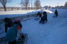 Дети старше - подготовительной группы во время дневной прогулки катают друг друга на санках.