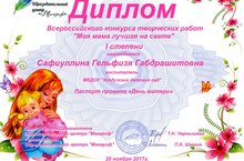 Дипломом I степени Всероссийского конкурса творческих работ "Моя мама лучшая на свете", награждается воспитатель Сафиуллина Г.Г. Паспорт проекта "День матери" старше-подготовительная группа.