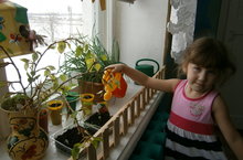 Дети старше-подготовительной группы ухаживают за растениями которые растут на окне .