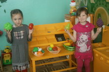 Дети старше-подготовительной группы под руководством воспитателя Сафиуллиной Г.Г. во время с/р игры "Магазин" закрепляют название овощей и фруктов на татарском языке.