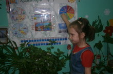 Дети старше-подготовительной группы во время дежурства в уголке природы, переставляют магнитики в изменениях условных обозначений на календаре природы.