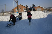 Дети старше-подготовительной группы во время дневной прогулки, катаются на санках, играют в снежки.