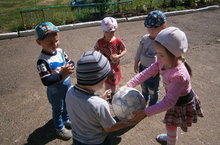 Дети ясельной группы под руководством воспитателя Тухватуллиной В.П. во время прогулки играли в игру "Передай мяч". Учить передавать мяч двумя руками и принимать его; развивать внимание; поддерживать самостоятельность в действиях.