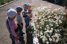 Пальчиком потрогать хрупкий стебелек.Воспитанники ясельной группы под руководством воспитателя Тухватуллиной В.П. во время прогулки наблюдали за цветами на клумбе, на этот раз это была ромашка.