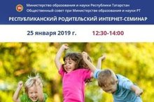 Во исполнение плана работы Министерства образования и науки Республики Татарстан 25.01.2019 с 12.30 до 14.00 состоится Республиканский родительский интернет-семинар «Здоровье и безопасность ребенка».Он-лайн трансляция собрания будет вестись на сайте Казанского инновационного университета имени В.Г.Тимирясова по адресу: https://ieml.ru/. -