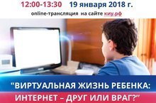 Во исполнение плана работы Министерства образования и науки Республики Татарстан 19.01.2018 с 12.00 до 13.30 состоится Республиканское родительское интернет-собрание «Виртуальная жизнь ребенка: интернет – друг или враг?». Он-лайн трансляция собрания будет вестись на сайте Казанского инновационного университета имени В.Г.Тимирясова по адресу: