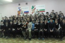 5 февраля 2015 года в нашей школе для 5-11 классов состоялась встреча с участником боевых действий в Чеченской республике Гафиатуллиным А.Я. В теплой дружеской атмосфере состоялась патриотическая беседа учащихся с героем Отечества. Альберт Якубович награжден медалью "За мужество", проходя военную службу в Чечне. На встрече речь шла о мужестве, чувстве долга перед Отечеством, о Родине, о единстве народного духа
