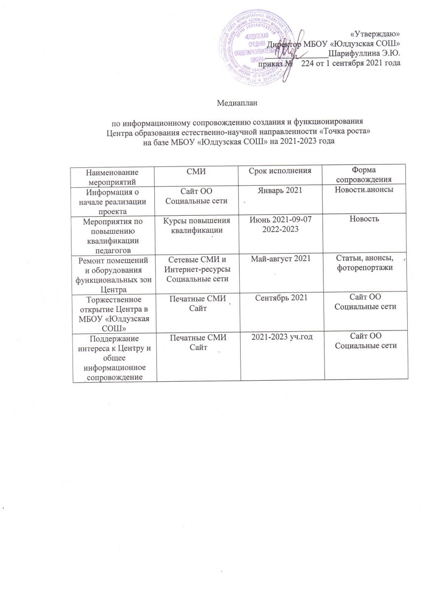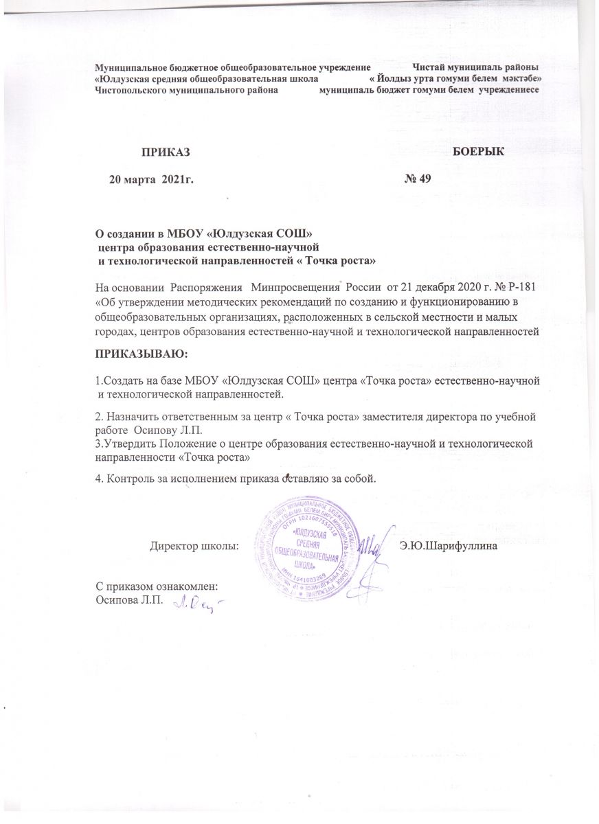 Приказ №49 от 20.03.2021 г. "О создании в МБОУ "Юлдузская СОШ"  центра образования естественно-научной и технологической направленности "Точка роста".