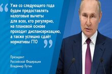 Со следующего года будет предоставляться налоговый вычет для всех, кто на плановой основе проходит диспансеризацию и выполняет нормативы ГТО, сказал Президент РФ Владимир Путин, выступая с Посланием Федеральному собранию. Глава государства отметил, что нужно поощрять людей, которые ответственно относятся к своему здоровью.