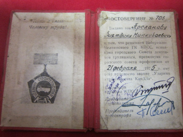 Удостоверение о присвоение звания "Ударник строительства КамАЗа"..JPG