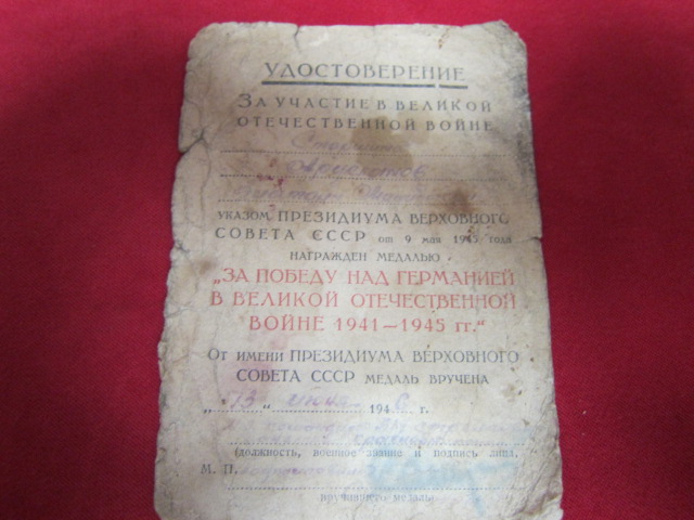 Удостоверение о награждении медалью "За победу над Германией" от 13 июня 1946 г..JPG