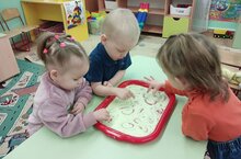 Воспитатель средней группы «Непоседы» познакомила детей с техникой рисования с помощью манной крупы. Рисовать крупами для детей не только интересно и увлекательно, но и полезно для развития мелкой моторики рук. Манипуляция сыпучим материалом помогает развивать творческое воображение, память, речь и мышление.