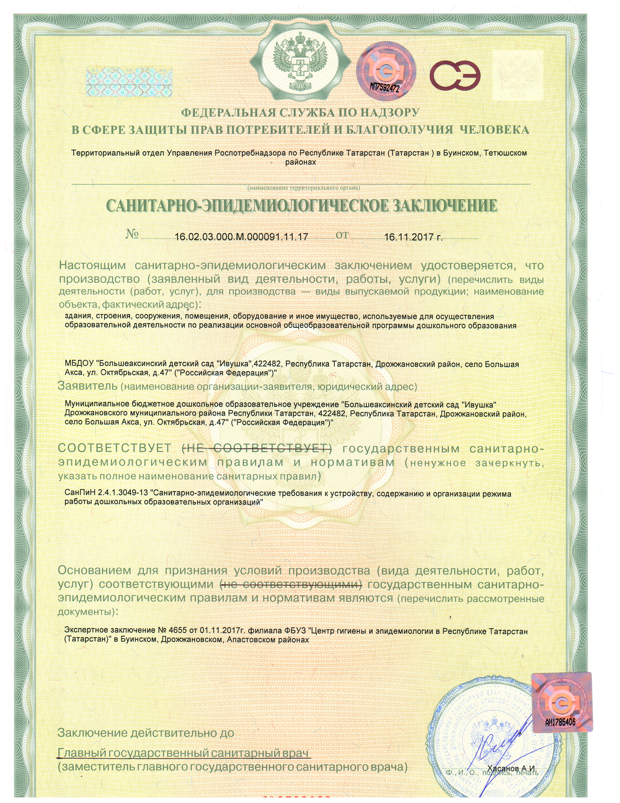 Санитарно-эпидемиологическое заключение №16.02.03.000.М.000091.11.17 от 16.11.2017г.