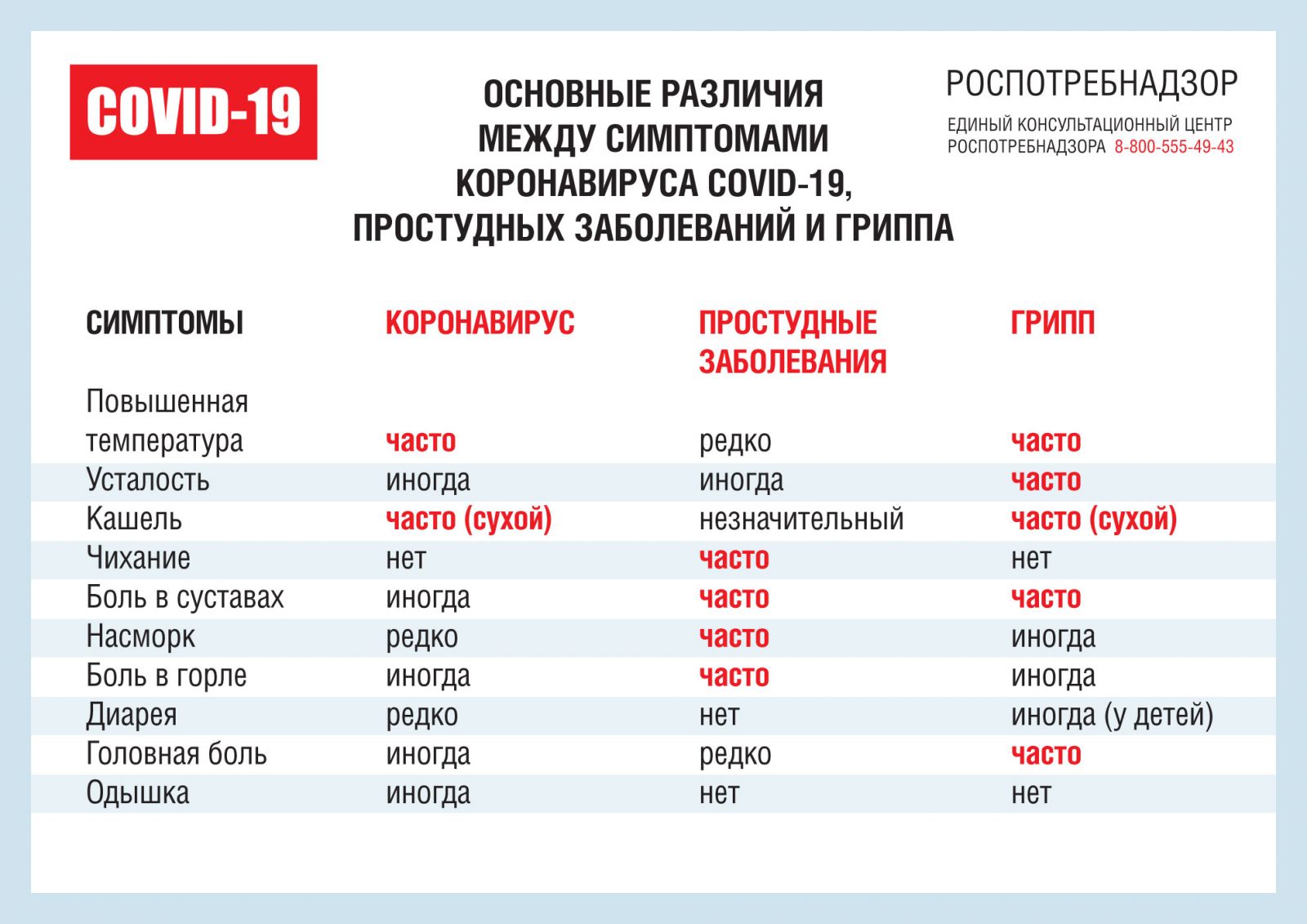 Памятка Роспотребнадзора Основные различия между симптомами коронавируса и простудных заболеваний
