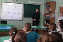 В начале обучающиеся посмотрели мультфильм «Святое писание». Затем выступил отец Владимир, он рассказал о святой Руси, о далеких временах, добрых молодцах да красных девицах которые умели пахать да косить, терема рубить, умели и холсты ткать, узорами вышивать, но не умели книги читать и письма писать. О том, что по просьбе князей на славянские земли прибыли два просветителя, братья мудрые Кирилл с Мефодием.