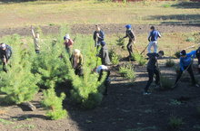 В день посадки леса выпускные 9 и 11 классы посадили в Аллее Выпускников сосны и ели, обновили Аллею Добра перед школой.
