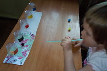 Без балалар белән яңа уен уйлап таптык.Аның өчен пластик стаканнарны уйратып кистек,алар өстенә тәрле төсле кәгазьләр ябыштырдык,сок эчә торган трубкалар алдык һәм йомшак ябыштыргыч тугәрәкләрне шул трубкалар ярдәмендә ,төсләрне туры китереп өреп кертәбез.Балаларга бик ошады бу уен.Барыбызда шатланып уйнадык.
