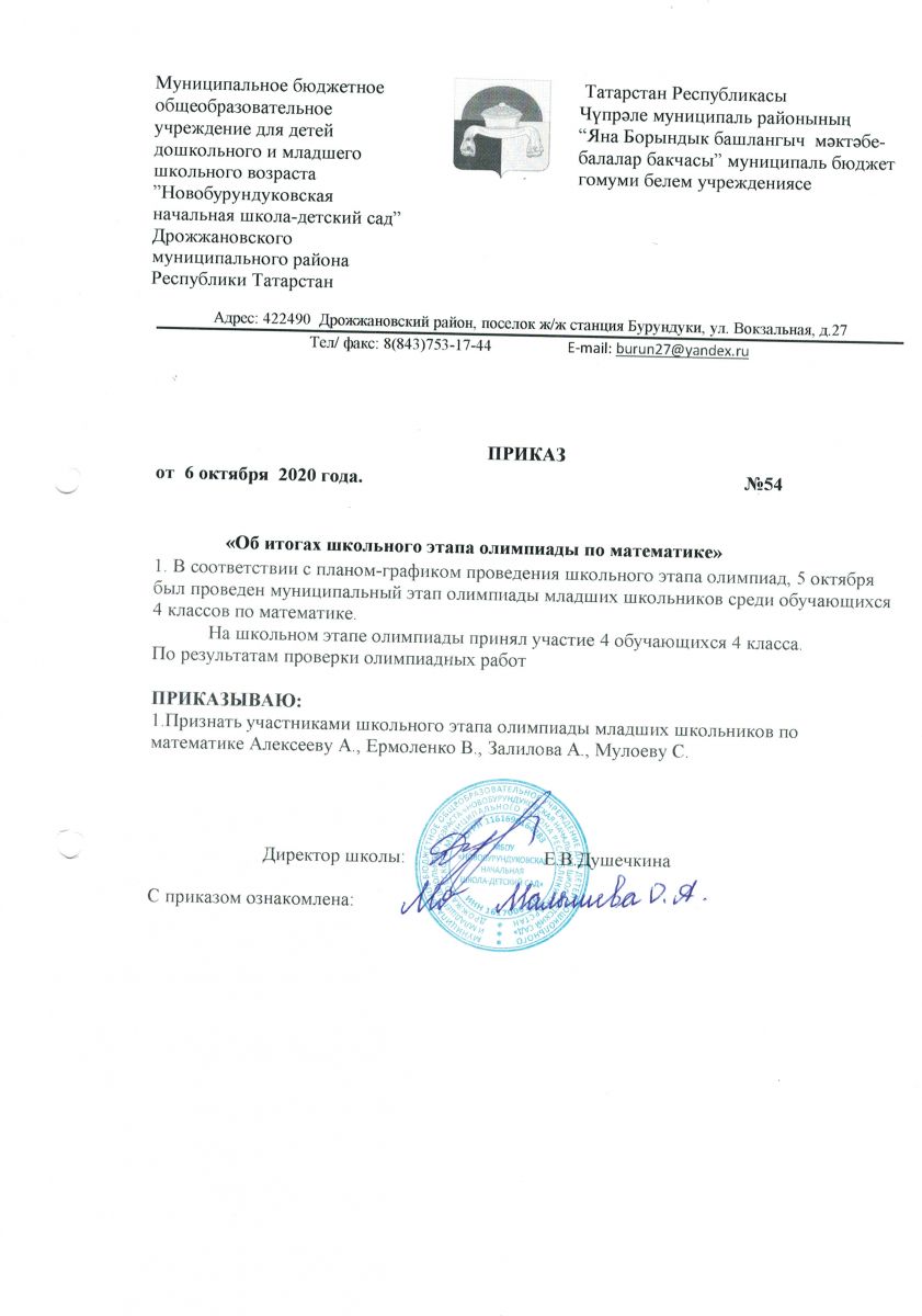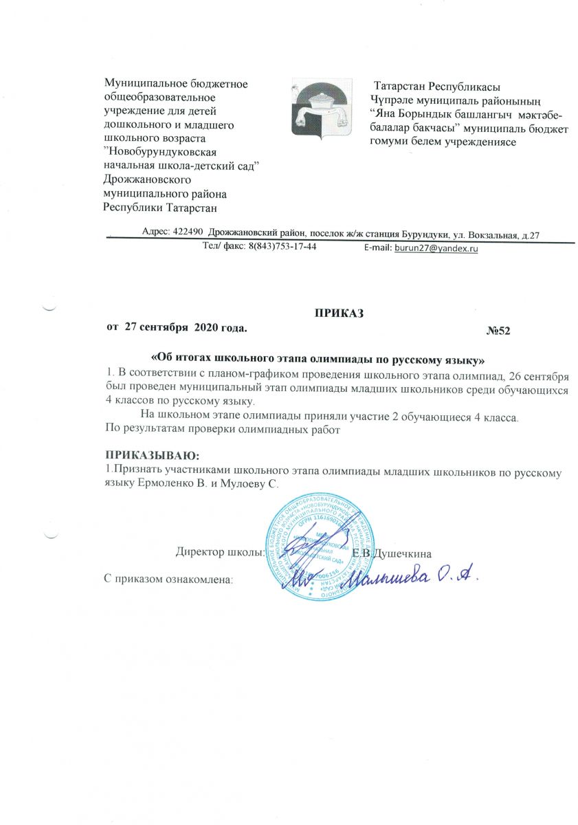 Приказ об итогах школьного этапа олимпиады по русскому языку 2019-2020 учебный год