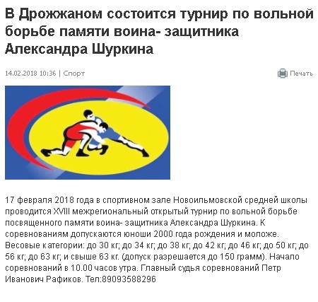 Соревнования по вольной борьбе 17 февраля в Новоильмовской сош. в память Александра Шуркина.